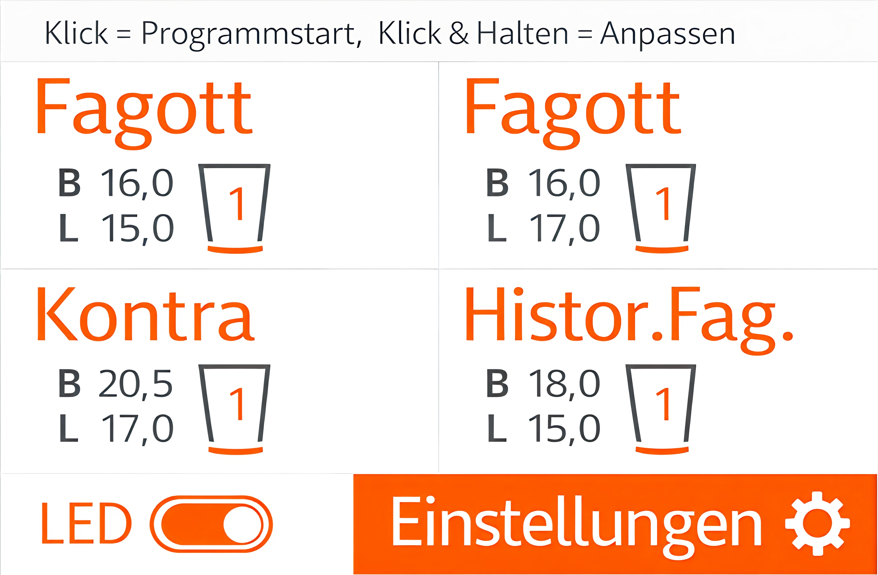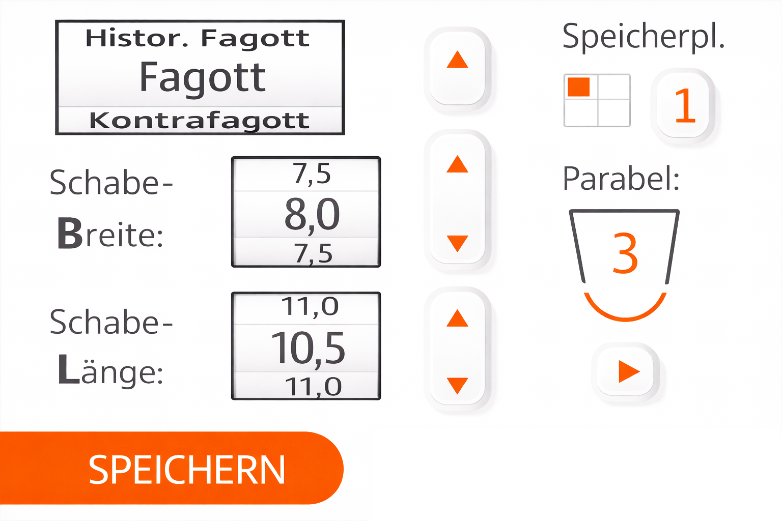 Schabebreite, -länge und Schabeform. Alles, was den Klang Ihres Rohres bestimmt, lässt sich direkt auf dem Touchscreen einstellen. Speichern Sie Ihren persönlichen Sound als Programm. Wenn Sie das nächste Mal Rohre machen, wartet er bereits auf Sie.