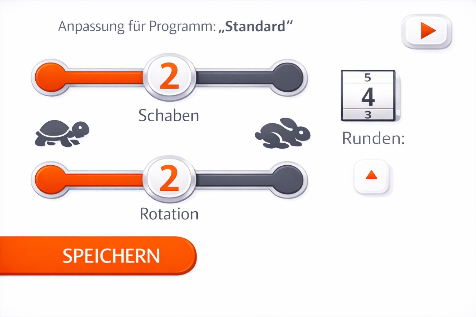 Stellen Sie präzise ein, wie jedes Programm abläuft: wie schnell das Messer über das Rohr geführt wird, wie schnell das Rohr rotiert und wie viele Durchläufe erfolgen. Einmal festlegen, speichern und jedes weitere Rohr entsteht exakt nach Ihren Vorgaben.