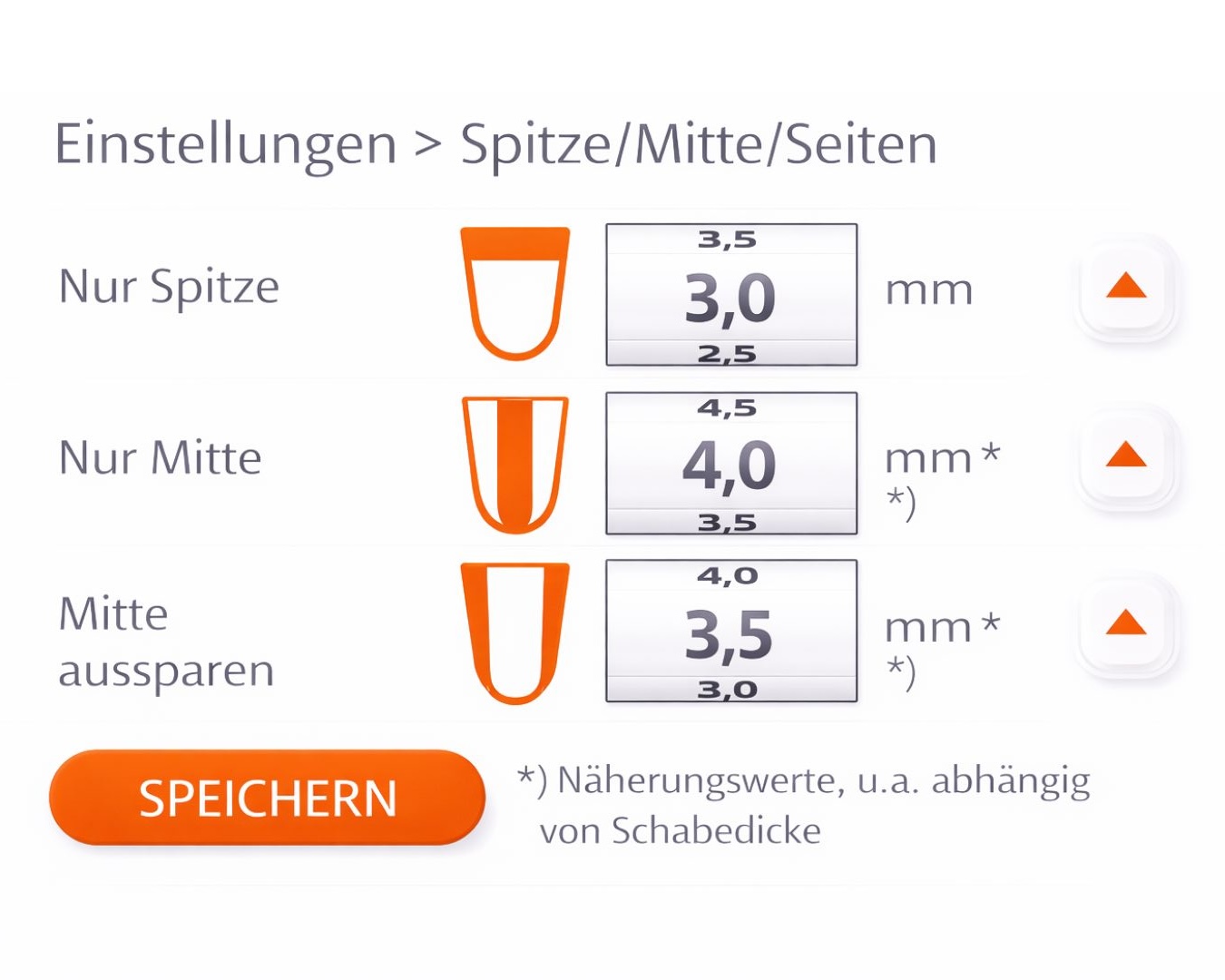 Wollen Sie Details nur an der Spitze, den Seiten oder der Mitte verfeinern? Wählen Sie den gewünschten Bereich aus, stellen Sie die Parameter ein und überlassen Sie der Maschine den Rest. Kein Raten, kein Überschaben, nur genau das Ergebnis, das Sie sich vorstellen.